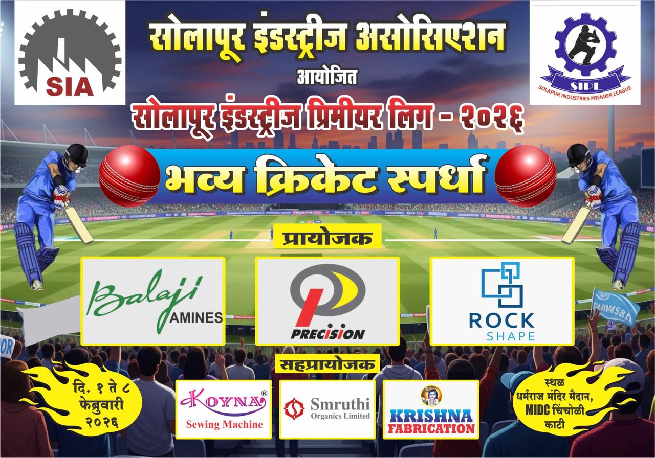 सोलापूर : सोलापूर सोलापूर इंडस्ट्रीज असोसिएशनतर्फे भव्य टेनिस बॉल क्रिकेट स्पर्धेचे आयोजन असोसिएशनतर्फे सोलापूर इंडस्ट्रीज प्रीमियर लीग – २०२६ अंतर्गत भव्य टेनिस बॉल क्रिकेट स्पर्धेचे आयोजन करण्यात आले आहे. ही स्पर्धा दि. १ ते ८ फेब्रुवारी २०२६ या कालावधीत चिंचोळीकाटी ग्रामपंचायतीच्या धर्मराज मंदिर मैदानावर आयोजित करण्यात येणार आहे.