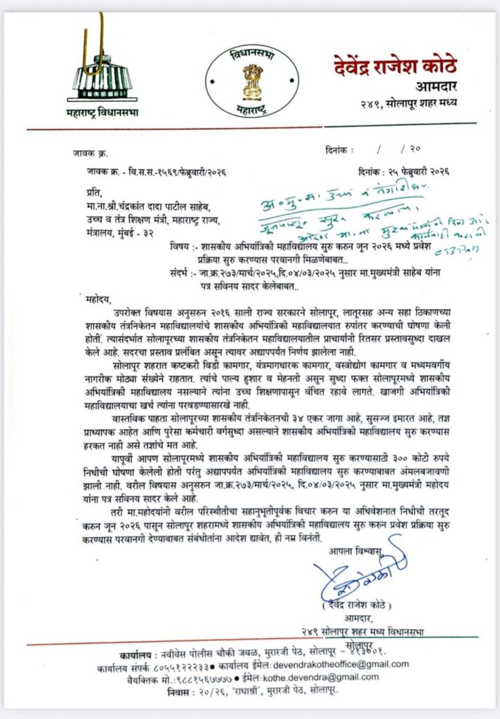 सोलापुरातील शासकीय अभियांत्रिकी महाविद्यालयाचा प्रश्न गेल्या ६० वर्षांपासून प्रलंबित आहे. सोलापूरसाठी मंजूर झालेले शासकीय अभियांत्रिकी महाविद्यालय इतर शहरात वळविण्यात आले. याबाबत मागणी केल्यानंतर तत्कालीन पालकमंत्री चंद्रकांत पाटील यांनी प्रयत्न करून सोलापूरला शासकीय अभियांत्रिकी महाविद्यालयाला मंजुरी मिळवून दिली. तंत्रनिकेतन महाविद्यालयाच्या ३४ एकर जागेवर शासकीय अभियांत्रिकी महाविद्यालय सुरू करता येईल. याकरिता २५० कोटी रुपयांचा प्रस्ताव तयार करण्यात आला आहे. या प्रस्तावाचा सकारात्मक विचार करून याच अर्थसंकल्पात त्याकरिता तरतूद करावी आणि येत्या जून महिन्यापासून हे महाविद्यालय सोलापूरात सुरू व्हावे अशी मागणी आमदार देवेंद्र कोठे यांनी २५ फेब्रुवारी रोजी चालू अधिवेशनात केली होती. याबाबत आमदार देवेंद्र कोठे यांनी मुख्यमंत्री देवेंद्र फडणवीस आणि उच्च आणि तंत्रशिक्षण मंत्री चंद्रकांत पाटील यांची भेटही घेतली होती.