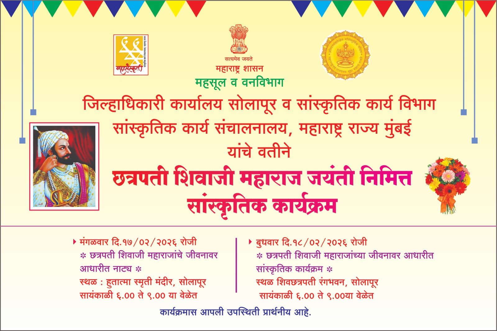 सोलापूर – छत्रपती शिवाजी महाराज यांच्या जयंतीनिमित्त सोलापूर जिल्हा प्रशासन आणि सांस्कृतिक कार्य विभाग यांच्या वतीने सोलापूर शहरात विविध सांस्कृतिक कार्यक्रमांचे आयोजन करण्यात आले आहे. या कार्यक्रमांद्वारे छत्रपती शिवाजी महाराज यांच्या अद्वितीय कार्याचा व जीवनमूल्यांचा प्रसार होणार असून नागरिकांनी मोठ्या संख्येने या कार्यक्रमास उपस्थित राहावे, असे आवाहन निवासी उपजिल्हाधिकारी अभिजीत पाटील यांनी केले आहे.