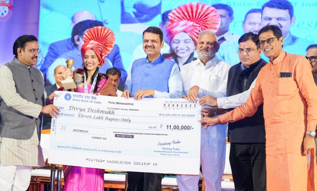 जागतिक बुद्धिबळ स्पर्धा विश्वविजेती ग्रँडमास्टर दिव्या देशमुखचा शालेय शिक्षण व क्रीडा विभाग आणि महाराष्ट्र बुद्धिबळ संघटना यांच्या संयुक्त विद्यमाने शनिवारी कविवर्य सुरेश भट सभागृह येथे नागरी सत्कार आयोजित करण्यात आला. यावेळी मुख्यमंत्री फडणवीस बोलत होते. मुख्यमंत्र्यांच्या हस्ते दिव्याचा सन्मान करीत तीन कोटी रुपयांचे बक्षीस प्रदान करण्यात आले. याशिवाय महाराष्ट्र बुद्धिबळ संघटनेकडूनही ११ लाख रुपयांचे बक्षिस प्रदान करण्यात आले. खासदार क्रीडा महोत्सव समितीकडून सन्मान करण्यात आला.