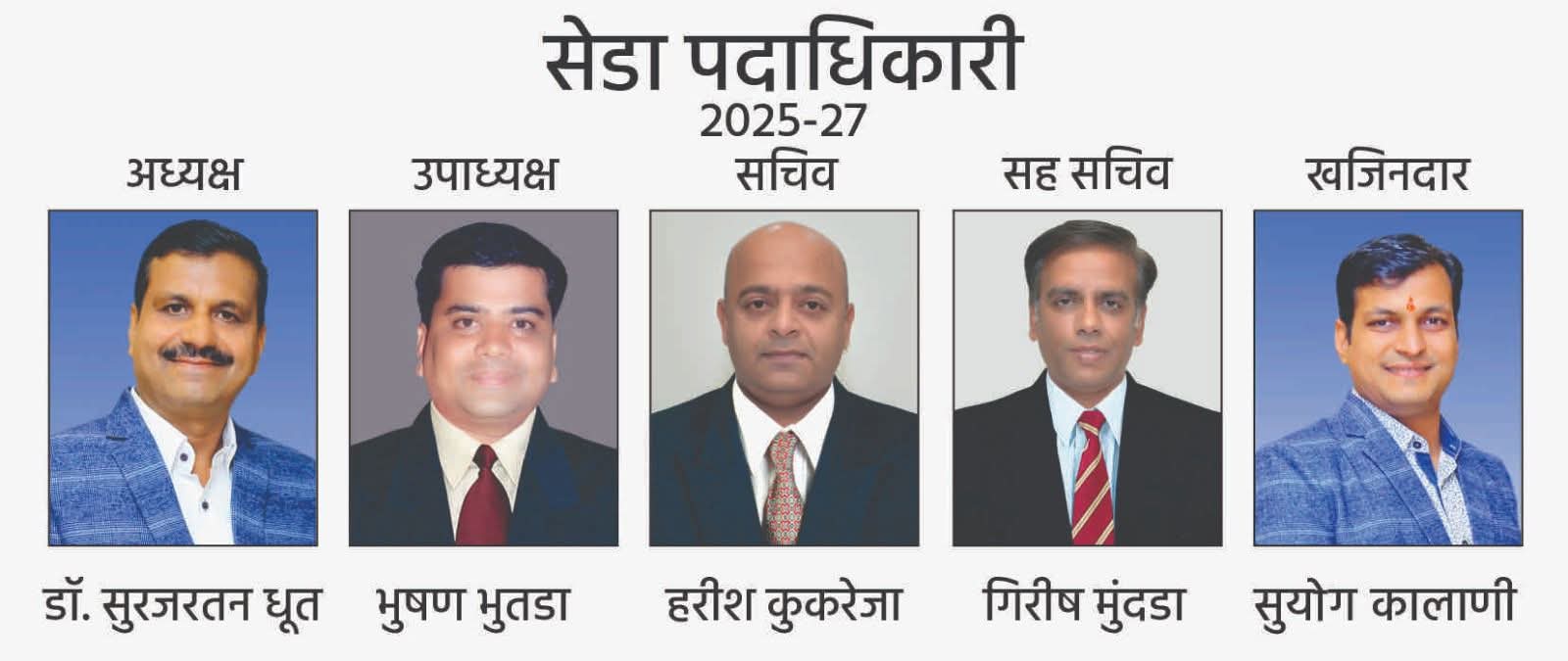 साेलापूर इलेक्ट्राॅनिक्स डिलर्स असाेसिएशन (सेडा) या इलेक्ट्राॅनिक्स्, हाेम अप्लायन्सेस, काॅम्प्युटर्स, सोलर उत्पादने, हेल्थ इक्विपमेंट्स व टेली कम्युनिकेशन्स् डिलर्स संस्थेच्या २०२५-२०२७ कालावधीसाठी अध्यक्षपदी डॉ. सुरजरतन धूत तर सचिवपदी हरीश कुकरेजा यांची निवड करण्यात आली. नुकत्याच झालेल्या संस्थेच्या वार्षिक सर्वसाधारण सभेत ही घाेषणा करण्यात आली. इतर पदाधिकारी पुढीलप्रमाणे : – बसवराज नवले , रवींद्र पाचलाग , चंद्रकांत शाहापूरे , विजय टेके , सचिन करवा , सुनील भांजे.