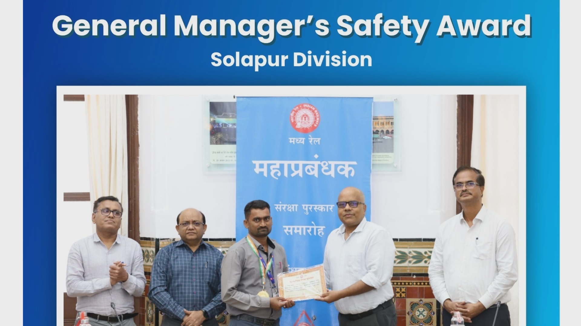 मध्य रेल्वेचे महाव्यवस्थापक राजीव श्रीवास्तव यांनी, दि. १५.०४.२०२६ रोजी मुंबई येथील छत्रपती शिवाजी महाराज टर्मिनस येथे आयोजित एका समारंभात, सोलापूर विभागातील मध्य रेल्वेच्या २ कर्मचाऱ्यांना ‘संरक्षा पुरस्कारा’ने सन्मानित केले.