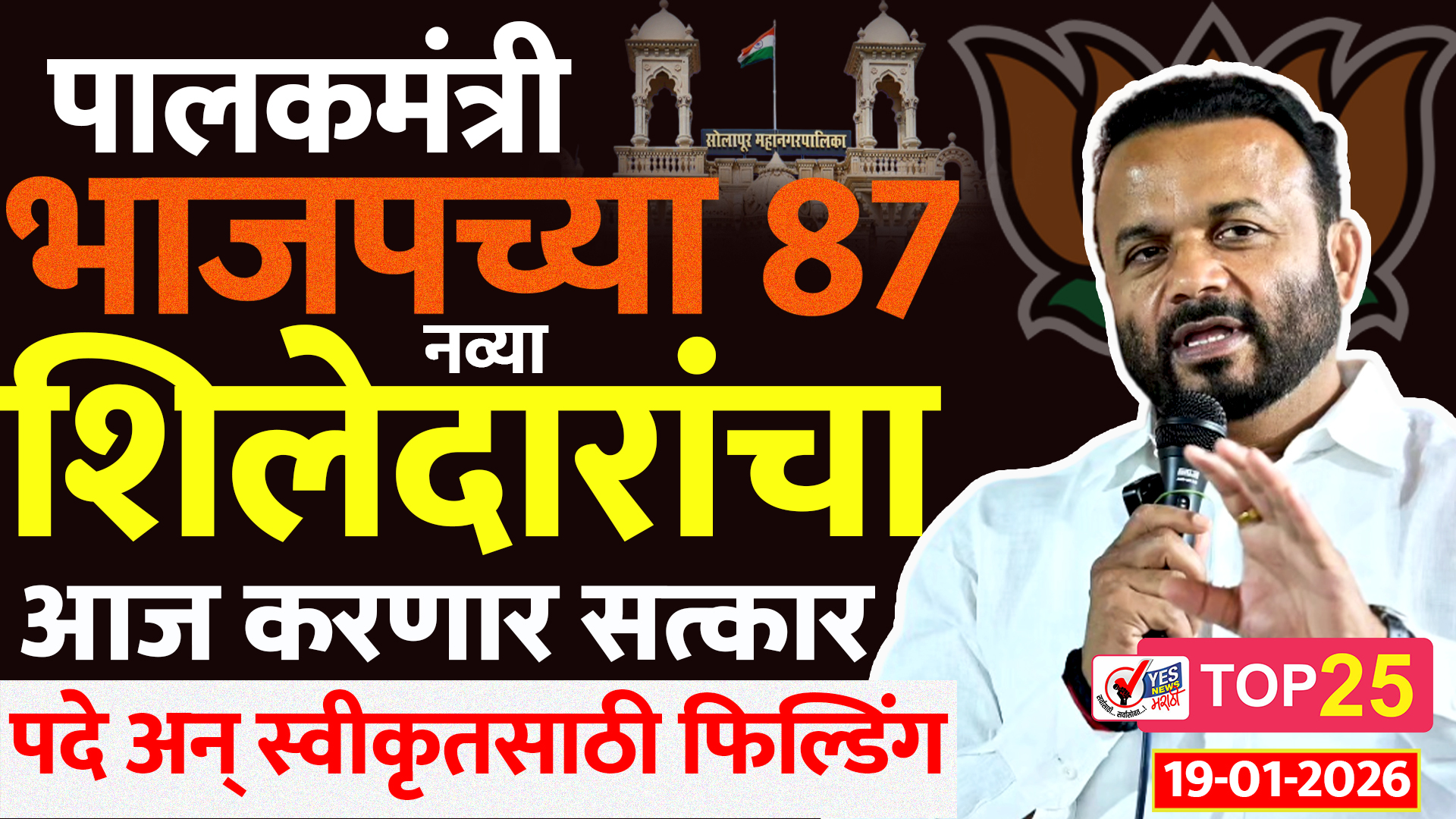 सोलापूर महापालिकेच्या निवडणुकीत विजयी झालेल्या भाजपच्या 87 नव्या नगरसेवकांचा सत्कार पालकमंत्री जयकुमार गोरे यांच्या हस्ते आज सायंकाळी सहा वाजता हॉटेल बालाजी सरोवर या ठिकाणी करण्यात येणार आहे. निमित्त सत्काराचे असले तरीही या माध्यमातून महापौर, स्थायी समिती सभापती, स्थायी समितीमधील सदस्य, तसेच स्वीकृत नगरसेवक याबाबत आता व्ह्यूव रचना आखली जाणार आहे . आजच्या बैठकीसाठी शहराध्यक्ष रोहिणी तडवळकर, आमदार सुभाष देशमुख, आमदार विजयकुमार देशमुख, आमदार देवेंद्र कोठे, आमदार सचिन कल्याणशेट्टी उपस्थित राहणार असल्याचे कळते. महापौर पदाचे आरक्षण येत्या दोन-तीन दिवसात शासनाकडून जाहीर होईल. त्यामुळे निवडून आल्यानंतर पालकमंत्री जयकुमार गोरे आता पुढचे नियोजन कसे करतात याची उत्सुकता शहरवासीयांना लागली आहे. स्वीकृत नगरसेवक होण्यासाठी मात्र अनेकांनी आपापल्या नेत्यामार्फत जोरदार फील्डिंग लावली आहे.