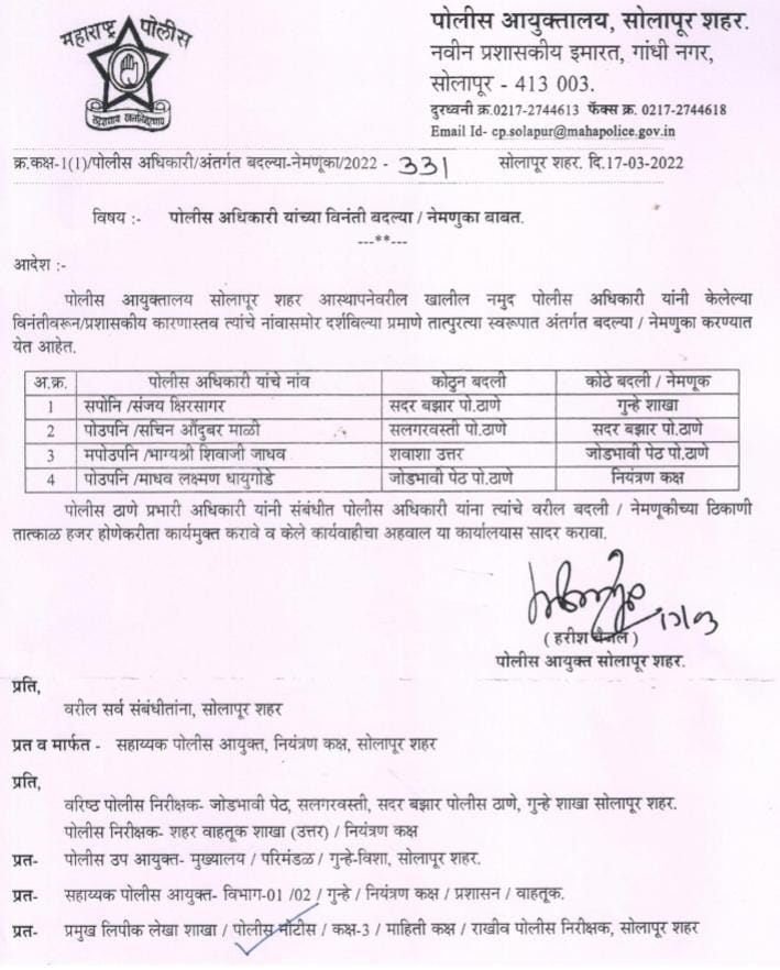 सलगर वस्ती पोलीस ठाणे येथे कार्यरत असलेले पोलीस उपनिरीक्षक सचिन औदुंबर माळी यांची बदली सदर बझार पोलीस ठाण्यात करण्यात आली आहे,शहर वाहतूक शाखा उत्तर येथे कार्यरत असलेले महिला पोलीस उपनिरीक्षक भाग्यश्री शिवाजी जाधव यांची बदली जोडभावी पेठ पोलीस ठाणे येथे करण्यात आली आहे. जोडभावी पेठ पोलीस ठाणे येथे कार्यरत असलेले पोलीस उपनिरीक्षक माधव लक्ष्मण धायगुडे यांची बदली नियंत्रण कक्ष येथे करण्यात आली आहे.