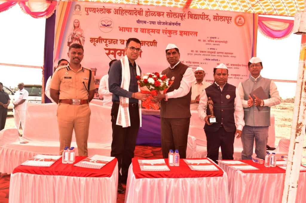 गुरुवारी, पुण्यश्लोक अहिल्यादेवी होळकर सोलापूर विद्यापीठाच्या ४८२ एकर परिसरात पीएम-उषा योजनेअंतर्गत मंजूर निधीतून उभारण्यात येणाऱ्या भाषा व वाङ्मय संकुल इमारतीचे भूमिपूजन सोलापूर महानगरपालिकेचे आयुक्त डॉ. सचिन ओम्बासे आणि पोलीस आयुक्त एम. राजकुमार यांच्या हस्ते झाले. यावेळी ते बोलत होते. या कार्यक्रमाच्या अध्यक्षस्थानी कुलगुरू डॉ. प्रकाश महानवर हे होते. यावेळी विद्यापीठाचे प्र-कुलगुरू डॉ. लक्ष्मीकांत दामा, सार्वजनिक बांधकाम विभागाचे कार्यकारी अभियंता अजयकुमार भोसले, व्यवस्थापन परिषदेचे सदस्य प्रा. देवानंद चिलवंत, प्रभारी कुलसचिव डॉ. अतुल लकडे, वित्त व लेखा अधिकारी डॉ. महादेव खराडे, परीक्षा विभागाचे संचालक डॉ. श्रीकांत अंधारे, अभियंता गिरीश कुलकर्णी, प्रल्हाद कांबळे, अधिसभा सदस्य ॲड. मल्लिनाथ शहाबादे, डॉ. वीरभद्र दंडे, डॉ. जैनुद्दीन मुल्ला, डॉ. नेताजी कोकाटे आदी मान्यवरांची उपस्थिती होती. कार्यक्रमाचे प्रास्ताविक व स्वागत पीएम उषा विभागाचे संचालक डॉ. प्रभाकर कोळेकर यांनी केले.