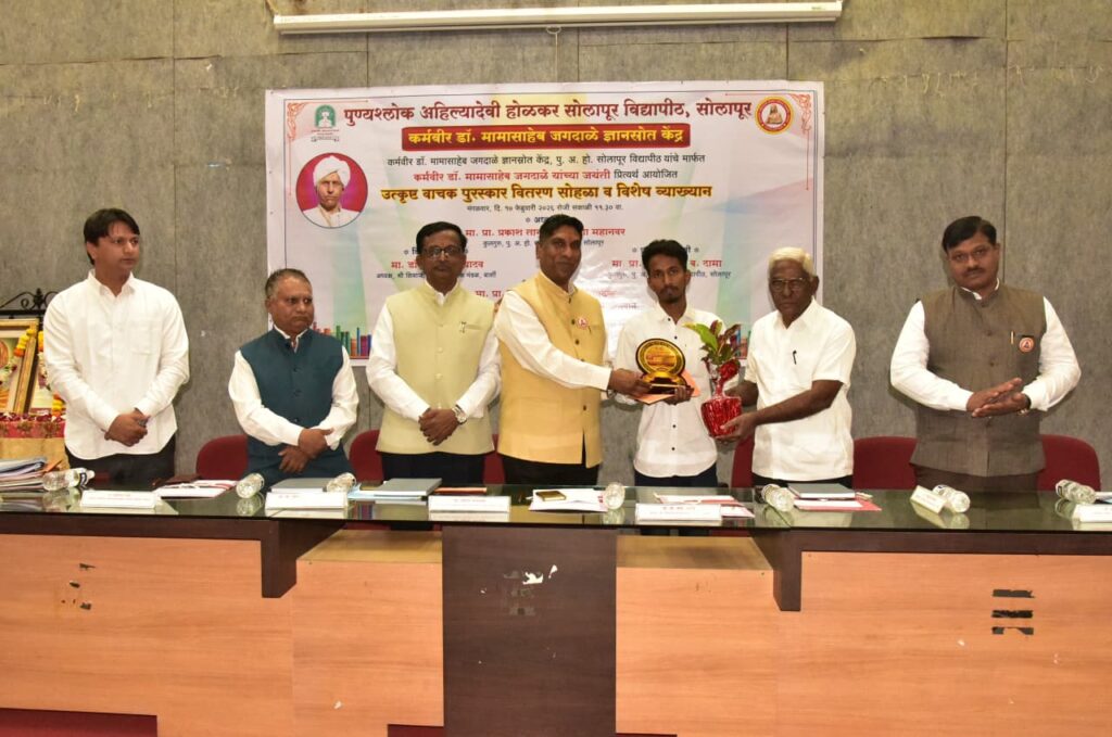 कर्मवीर डॉ. मामासाहेब जगदाळे यांच्या जयंतीनिमित्त दरवर्षी उत्कृष्ट वाचकांचा सन्मान केला जातो. यंदा विद्यार्थी गटातून सिद्धी येडम व सचिन इक्कलाकी, शिक्षक गटातून डॉ. तानाबाई पाटील आणि कर्मचारी गटातून सहायक कुलसचिव डॉ. शिवाजी शिंदे यांना उत्कृष्ट वाचक पुरस्कार प्रदान करण्यात आला. रोख रक्कम, स्मृतिचिन्ह, शाल आणि वृक्षरोप असे पुरस्काराचे स्वरूप होते.