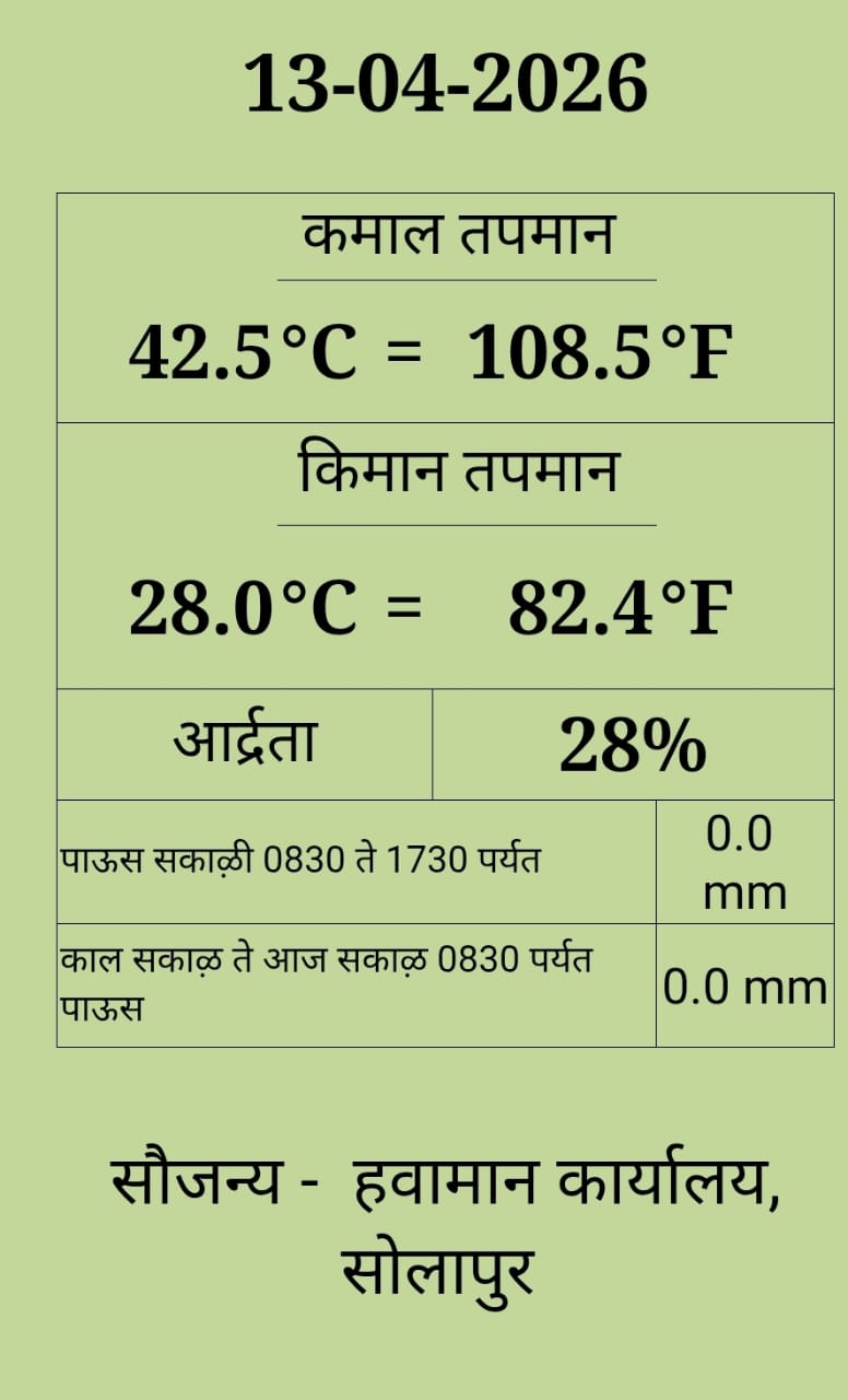 गेल्या काही दिवसांपासून तापमानात सातत्याने वाढ होत आहे. आजची आकडेवारी पाहता उन्हाच्या तीव्रतेने उच्चांक गाठला आहे. कमाल तापमान: ४२.५° से (१०८.५° फॅ) किमान तापमान: २८.०° से (८२.४° फॅ) हवेतील आर्द्रता: २८% दुपारच्या वेळी रस्ते ओस , सकाळी १० वाजल्यापासूनच उन्हाच्या झळा लागायला सुरुवात होत आहे. दुपारी १२ ते ४ या दरम्यान तापमानाचा पारा ४२ अंशांच्या वर गेल्याने शहरातील मुख्य रस्त्यांवर शुकशुकाट पाहायला मिळत आहे. हवेतील आर्द्रता कमी (२८%) असल्याने कोरड्या उन्हामुळे अंगाची लाहीलाही होत आहे. राज्यातील सर्वात उष्ण शहर म्हणून ओळख असलेल्या सोलापूरमध्ये उन्हाचा तडाखा आता असह्य होऊ लागला आहे. गेल्या दोन दिवसांपासून सोलापूरचे तापमान ४१.६°C ते ४२.५°C च्या दरम्यान स्थिरावले असून, दुपारच्या वेळी रस्ते ओस पडू लागले आहेत. हवामान खात्याने दिलेल्या अंदाजानुसार, पुढील आठवडाभर उष्णतेची ही लाट कायम राहण्याची शक्यता आहे.
