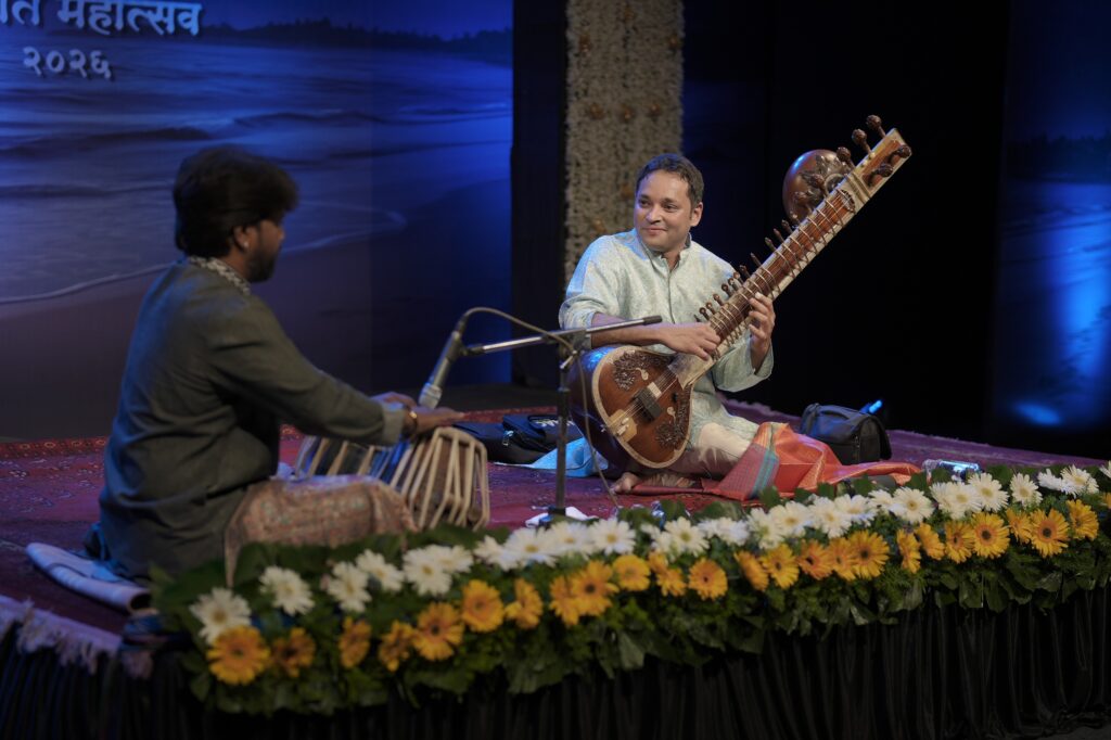पहिल्या सत्रात प्रख्यात सतारवादक निखिल पटवर्धन यांनी राग पुरिया कल्याणने जणू संध्याकाळी एक शांत दीप प्रज्वलित केला. सतारीचा पहिला सूर उमटताच सभागृहातील प्रेक्षक शहारले. आलापातून हळूहळू उलगडणारे सूर मनाचा खोलवर ठाव घेत होते. ते कधी मौन प्रश्न विचारत होते, तर सूर सतारीतून त्यांना उत्तर देत होते. विलंबित बंदिशीतल्या गहिऱ्या छटा आणि द्रुत बंदिशीतील तेजस्वी उंची यांतून एक भावप्रवास उलगडत गेला. मारवा थाटातील या रागात सतार जणू स्वतःशीच संवाद साधत होती आणि रसिक त्या संवादाचे साक्षीदार बनले होते. तबल्यावर पांडुरंग पवार यांनी दिलेली समर्थ साथ या सुरेल संभाषणाला अधिक अर्थपूर्ण बनवत होती. सतार आणि तबल्याच्या या जुगलबंदीतून जे काही घडत होतं, ते ऐकणं नव्हतंच, ते जगणं होतं. सुरुवातीला निखिल पटवर्धन यांनी सतारीबद्दल सांगितलेले काही शब्दही रसिकांच्या मनाशी थेट नातं जोडणारे ठरले.दुसऱ्या सत्रात स्वरांनी भावनांचा हात धरला.